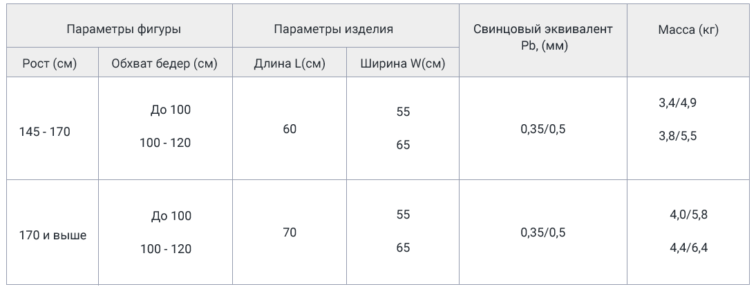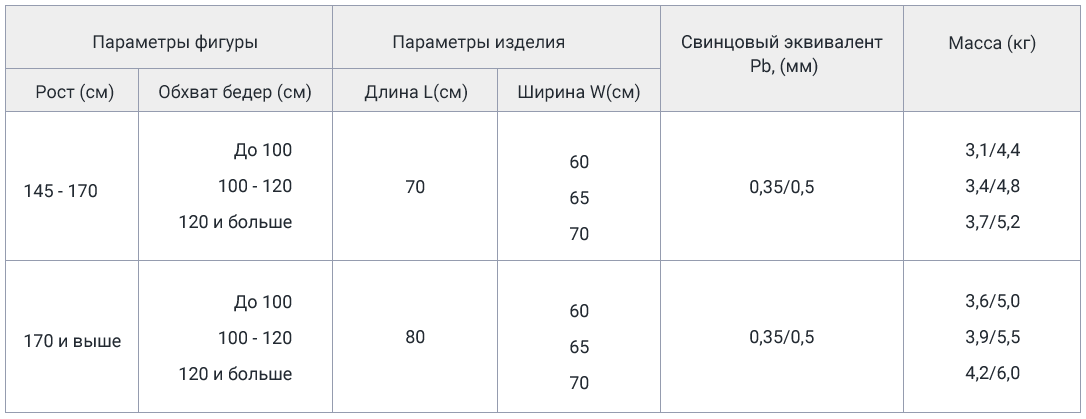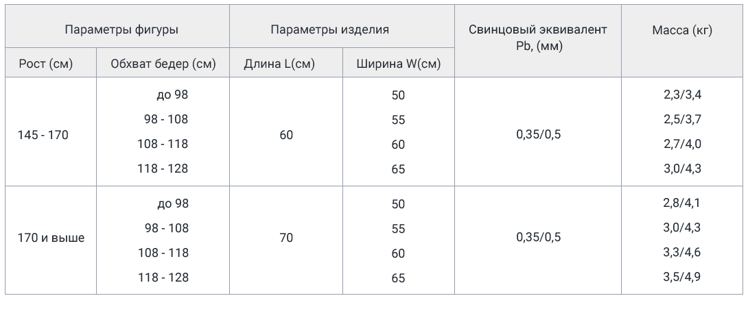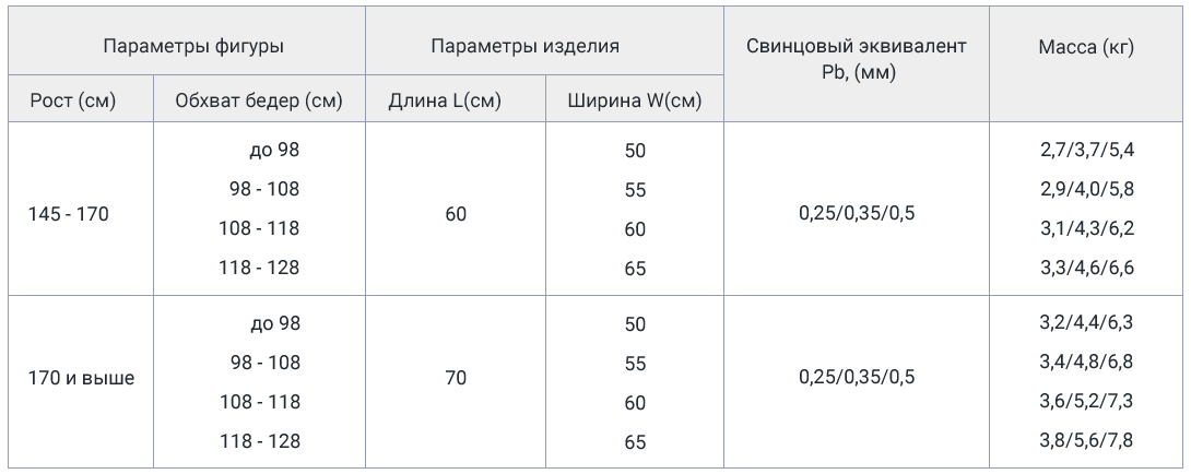 Призначена для захисту з усіх боків області гонад та кісток тазу. Застосовується при дослідженнях внутрішніх органів грудної клітки та травлення. Конструкція спідниці забезпечує ефективніший захист з боку рентгенівського випромінювання за рахунок місць перекриття порожнистої спідниці, в яких свинцевий еквівалент подвоюється. Ремінь із текстильною застібкою забезпечує легке та швидке надягання та зняття спідниці, а також її надійну фіксацію на талії.Залежно від віку та ступеня захисту, пропонуємо в таблиці обрати кращі варіанти спідниць.